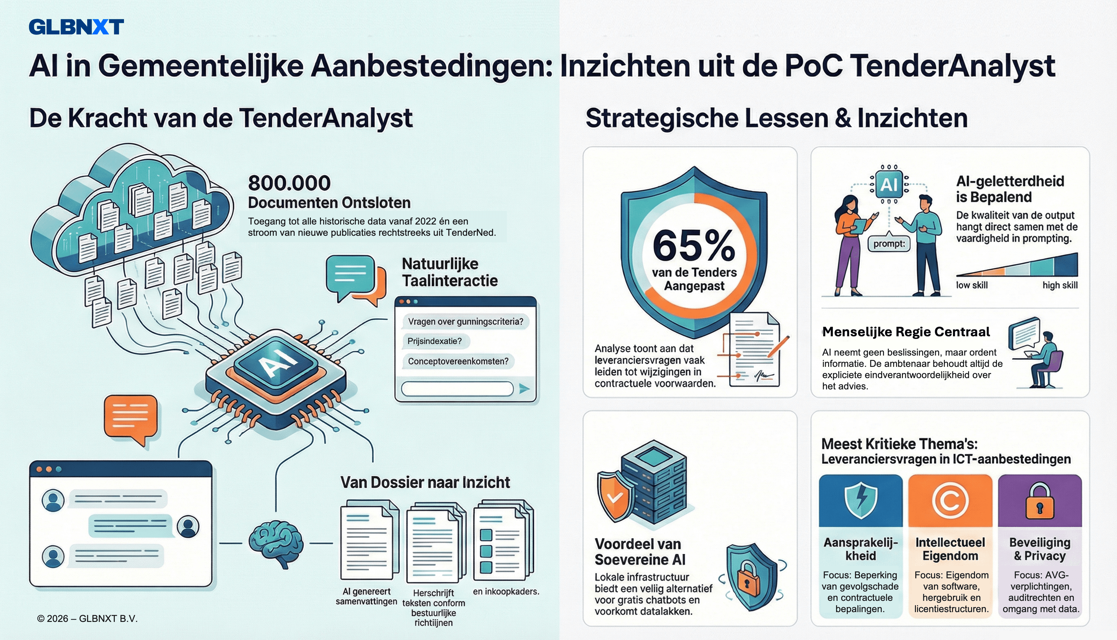 Wat deze proof of concept kenmerkte, was de open samenwerking tussen partijen met complementaire domeinexpertise. De gebruikersverenigingen vervulden een verbindende en kaderstellende rol, gemeenten brachten praktijkervaring en kritische reflectie vanuit het aanbestedingsdomein in, en GLBNXT leverde het platform, de AI-expertise en de begeleiding.